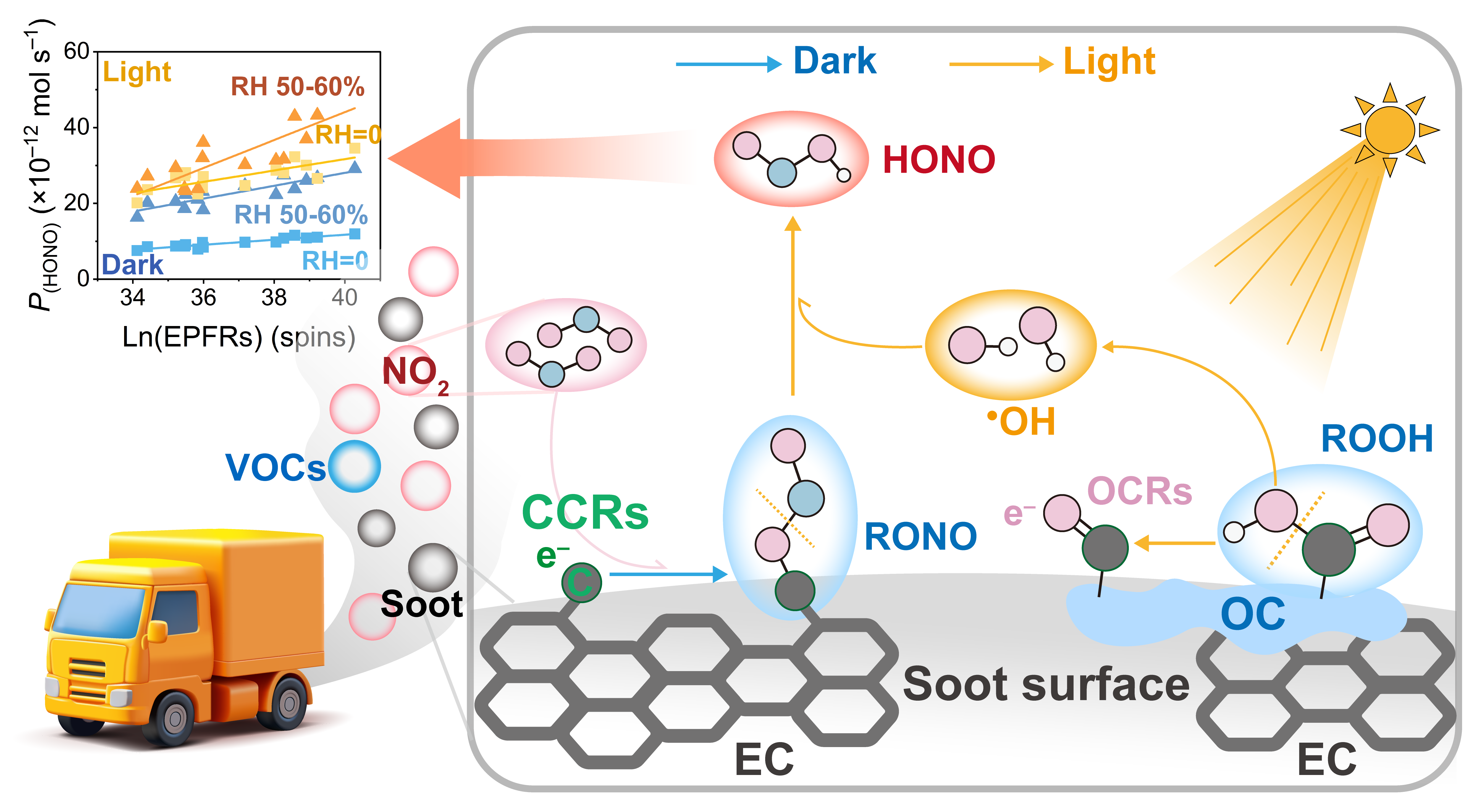 亚硝酸(HONO)是大气中重要的含氮污染物,作为羟基自由基(•OH)的主要前体物,还会影响大气的氧化能力、加速二次污染的形成。近年,环境持久性自由基(EPFRs)在亚硝酸生成过程中的作用机制受到广泛关注。作为一种广泛存在的活性组分,EPFRs可在大气颗粒物中长期稳定存在,其中具有较高反应活性的碳中心自由基,不仅促进活性氧物种(ROS)生成,还参与二氧化氮(NO2)非均相反应,加速亚硝酸的生成。柴油车排放的烟炱(Soot)是城市大气中EPFRs的重要载体(浓度约1015–1017 spins·m-3)。既往研究发现烟炱中的有机碳和元素碳共同影响亚硝酸的生成,但二者的协同作用机制及真实环境条件下烟炱中EPFRs参与HONO生成的反应路径和速度仍存在认知空白。