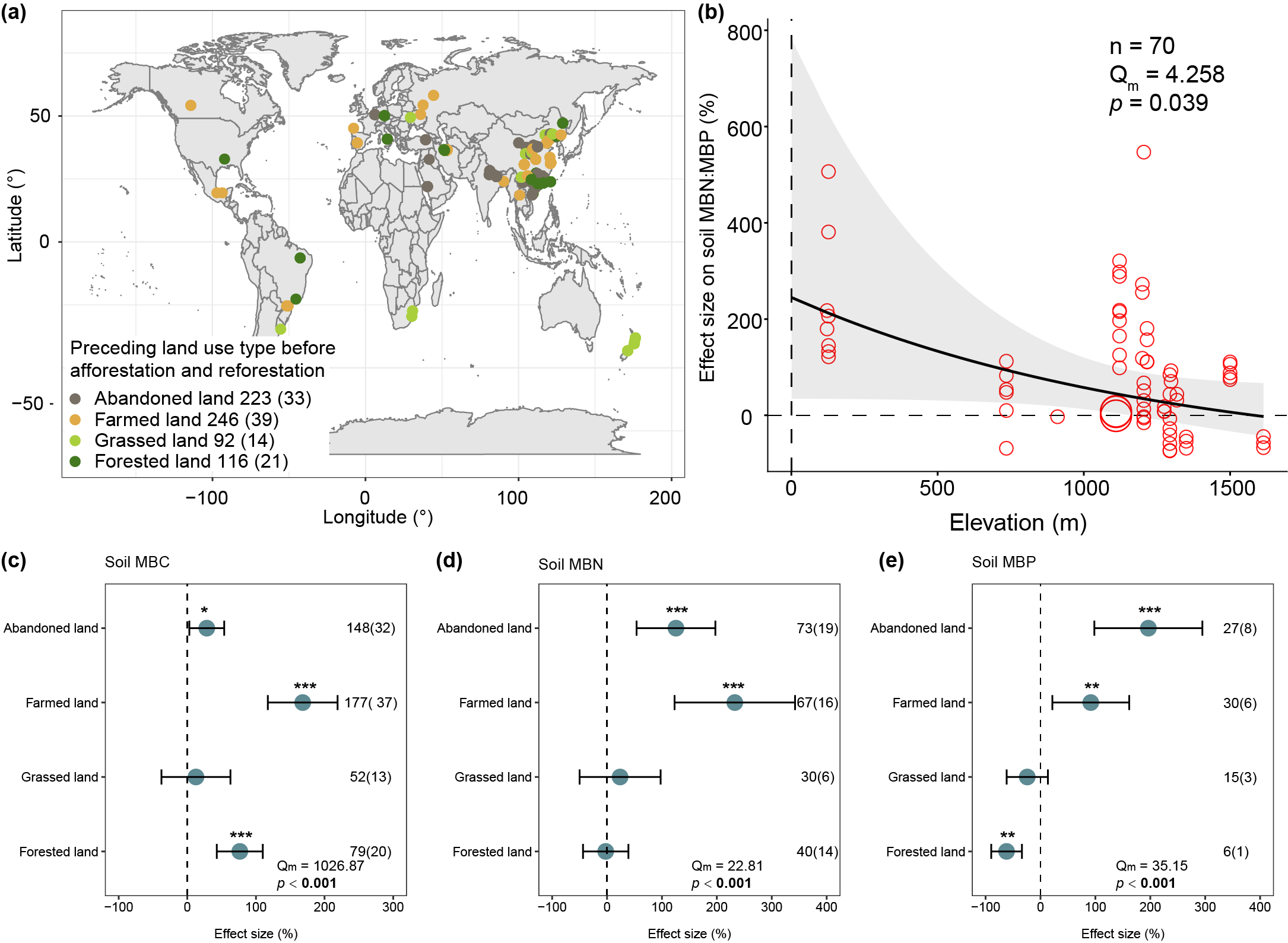 造林和再造林是全球变化背景下重要的生态恢复手段,而土壤微生物生物量碳(MBC)、氮(MBN)、磷(MBP)及其化学计量比是衡量生态系统恢复质量的关键指标。然而,造林和再造林如何重塑土壤微生物碳、氮、磷储量及其化学计量比,其背后的主导驱动因素仍缺乏全球尺度的系统认识。