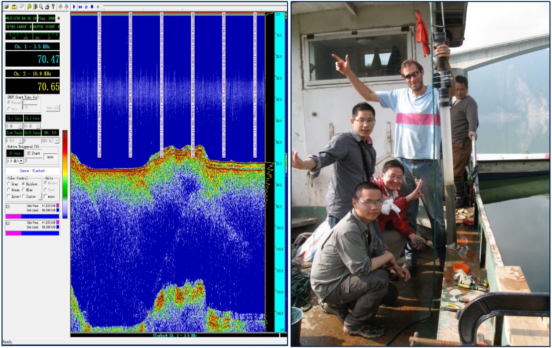图1 中美科学家在紫坪铺水库开展沉积物声学扫描和岩心钻取工作