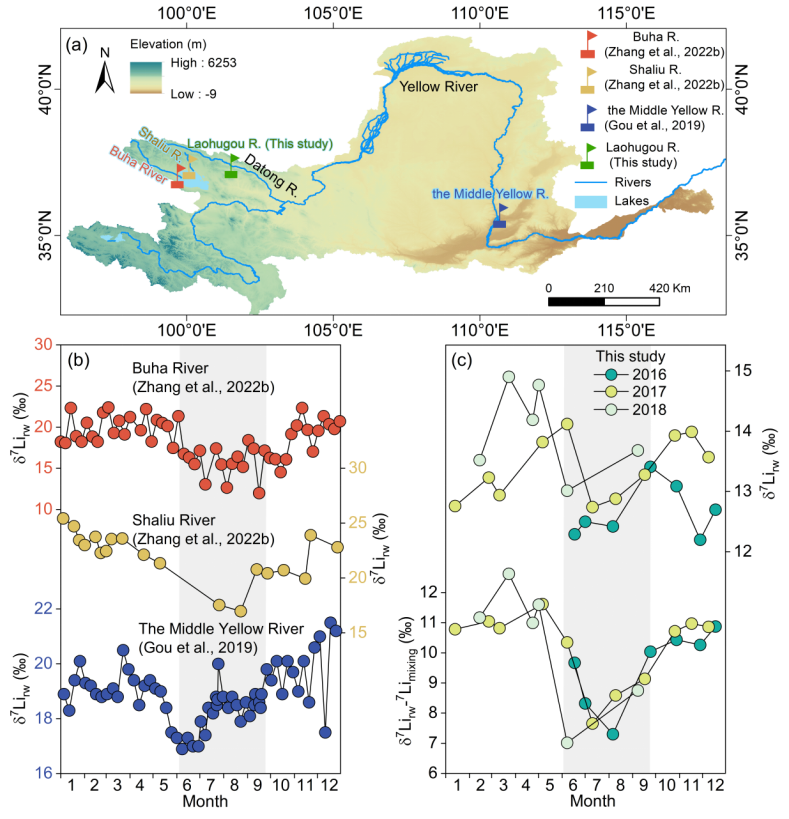 为此,地球环境研究所团队选取了硫化物矿物氧化普遍存在的祁连山老虎沟冰川流域为研究对象,自2016年到2018年对流域中河水开展了长达3年的每周持续定点采样,结合高时间分辨率的水文和水化学数据,对具有强烈硫化物氧化背景下的冰川河流δ7Li行为进行了系统研究。结果发现:老虎沟流域内的河水δ7Li组成(12.2‰-14.9‰)普遍低于非山区平坦地形的河流δ7Li(~26.2‰),但与世界其他高山地区的河流δ7Li相当。此外,在老虎沟流域内,河水δ7Li季节性差异较小(~3‰),而在经过大气降雨和冰融水输入校正后,雨季高侵蚀期的河流δ7Li比旱季低侵蚀期降低了约7‰,与东亚季风区其他河流类似,展现出明显的水文依赖性(图1)。
