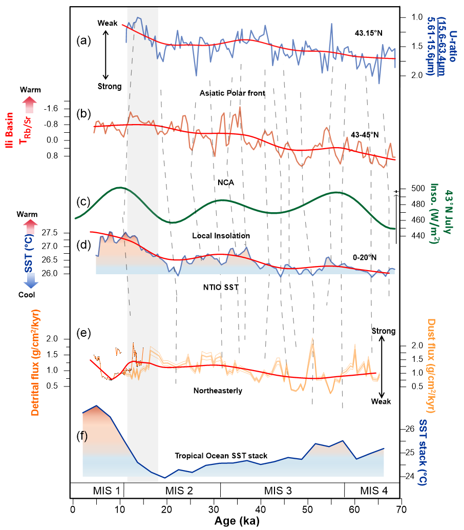 在现代土壤Rb/Sr比值与气候要素关系研究的基础上,团队进一步选取新疆伊犁盆地塔勒德与昭苏黄土剖面(图1)的Rb/Sr比值数据进行综合集成分析,重建了该区域过去7万年的春夏气温变化历史。重建结果显示:MIS4(深海氧同位素第4阶段, 70-57 ka)与MIS3b(54-44 ka)为研究时段内的气温低谷期;约12.5 ka(千年)时气温达到峰值,此后在全新世早中期呈现逐步下降趋势。这一温度变化记录与天山、青藏高原东北部湖泊沉积所揭示的温度演变规律基本一致(图2)。尤为值得关注的是,从MIS3a(44-32 ka)到MIS2(32-12 ka),研究区出现了显著的增温趋势,对比发现这一现象与北热带印度洋海表温度上升及由此引发的哈德莱环流调整存在密切关联。该证据表明,中亚地区的气候演变不仅受高纬度冰量变化和轨道尺度辐射强迫的控制,还深度受到低纬度海洋热状况的调节作用(图3)。