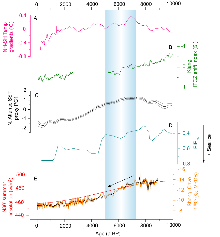 图2 神奇洞 δ18O记录与南北半球温度梯度、热带辐合带(ITCZ)及海冰记录的对比