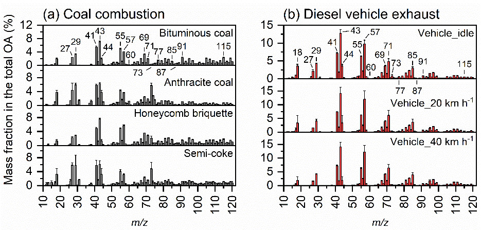 图2. (a)煤炭燃烧和(b)机动车尾气源排放有机气溶胶的质谱特征。