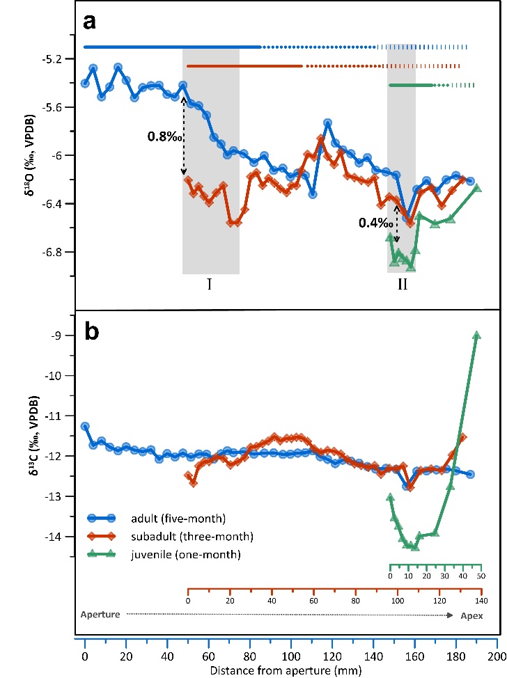 图2. 室内培养的非洲大蜗牛(Achatina fulica)壳内δ18O(a)和δ13C值(b)沿生长带的变化。x轴为从壳口(0 mm)到壳顶的距离。