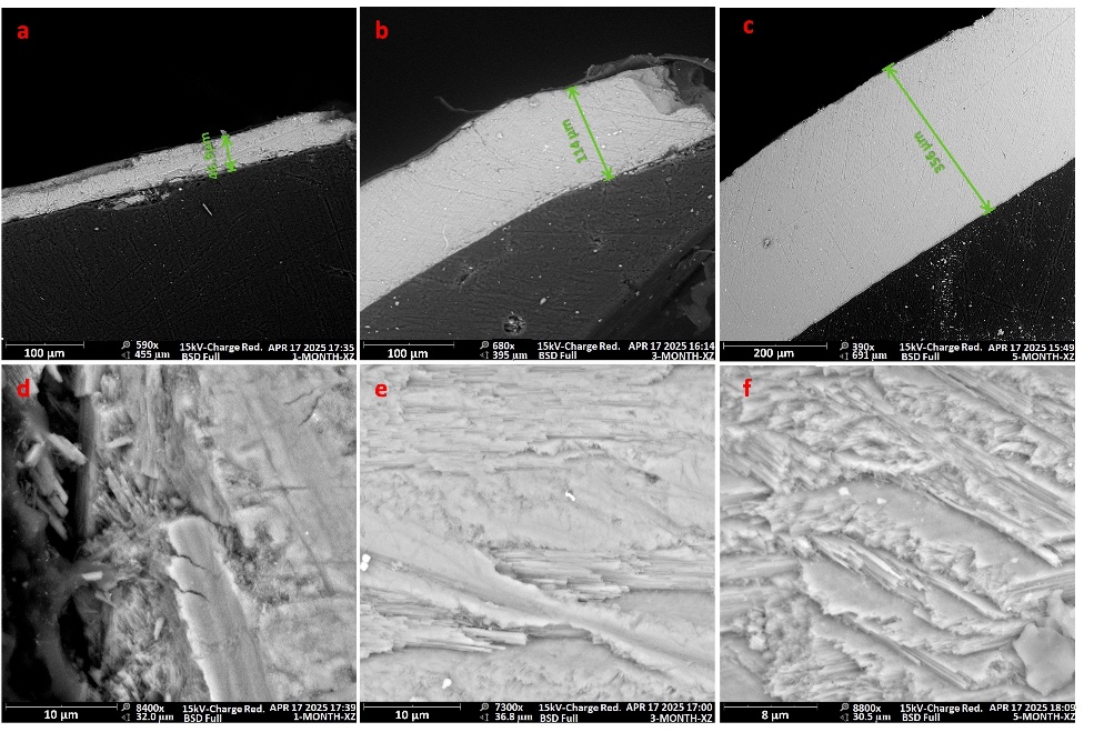 图3. 室内培养的不同生长阶段的Achatina fulica SEM图像 (a–c) 1个月、3个月和5个月龄个体壳口附近的横截面厚度SEM显微照片. (d–f) 1个月、3个月和5个月龄蜗牛壳体横截面微结构的高倍放大SEM图像。