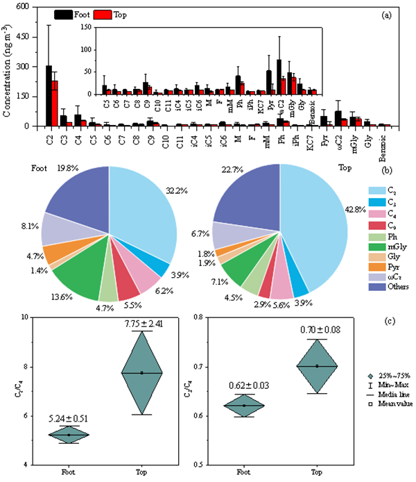 图 2 沙尘事件期间华山山脚与山顶 (a)二元羧酸及其相关化合物的分子组成(b)主要二元羧酸相对百分比及(c)C2/C4与C3/C4比值