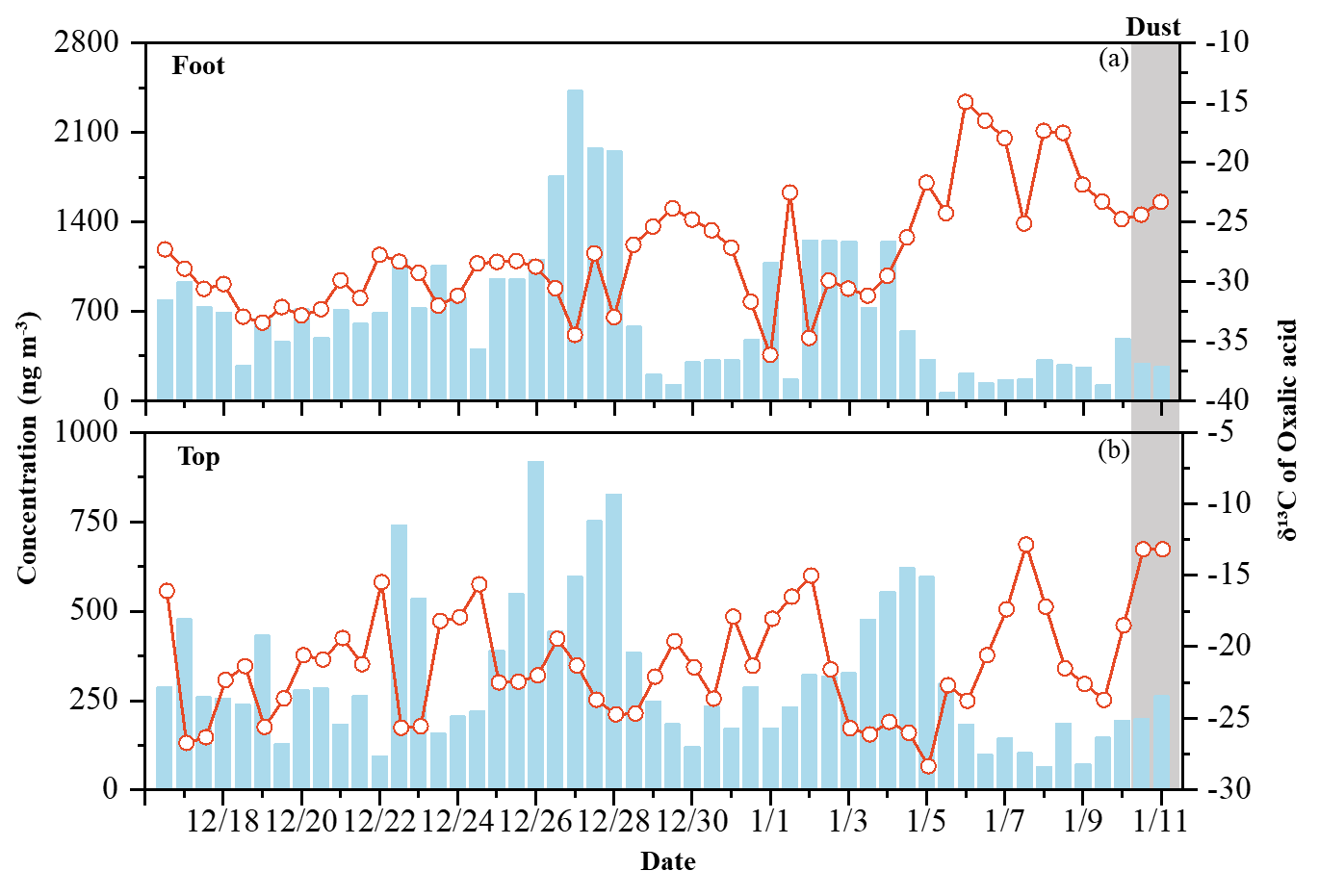 为探究关中地区近地面人为污染对高山自由对流层大气环境的影响,中国科学院地球环境研究所气溶胶理化过程及环境效应团队在华山开展系统观测,并在之前的研究中发现,夏季白天的谷风可将地表的污染物输送至山顶影响自由对流层的化学组成,但冬季低温导致的边界层压低显著抑制了局地污染物向山顶的扩散,使高海拔地区气溶胶主要来源于远距离输送。本研究进一步聚焦于冬季观测期间的一次强沙尘事件,分析沙尘传输过程中近地面和山顶大气气溶胶中二元羧酸类SOA的分子组成和稳定碳同位素分布的垂直差异。结果表明:非沙尘期,草酸(C2)主要通过在细颗粒物中的液相氧化反应生成;而在沙尘期间,其形成路径则转变为在粗颗粒物表面的非均相化学反应(图1)。高海拔站点大气颗粒物主要源于远距离输送,受沙尘影响尤为显著,具体表现为:气溶胶老化指标增强(C2/C4比值升至7.75,图2)、δ13C值富集(较非沙尘期增加+8.3‰,图3)以及C2从细模态向粗模态的明显迁移(图4)。研究指出,粒径分布的转变与沙尘老化过程中形成的Ca(NO3)2吸湿性涂层密切相关,其催化的表面氧化反应与金属-草酸盐络合作用产生协同效应,共同导致δ13C显著富集。本研究阐明了沙尘老化过程中C2生成路径、粒径分布及δ13C特征的改变,并揭示了其显著的海拔差异性,为理解沙尘传输过程中二次有机气溶胶的转化提供了关键依据,并深化了对山地大气化学和区域气候效应的认知。