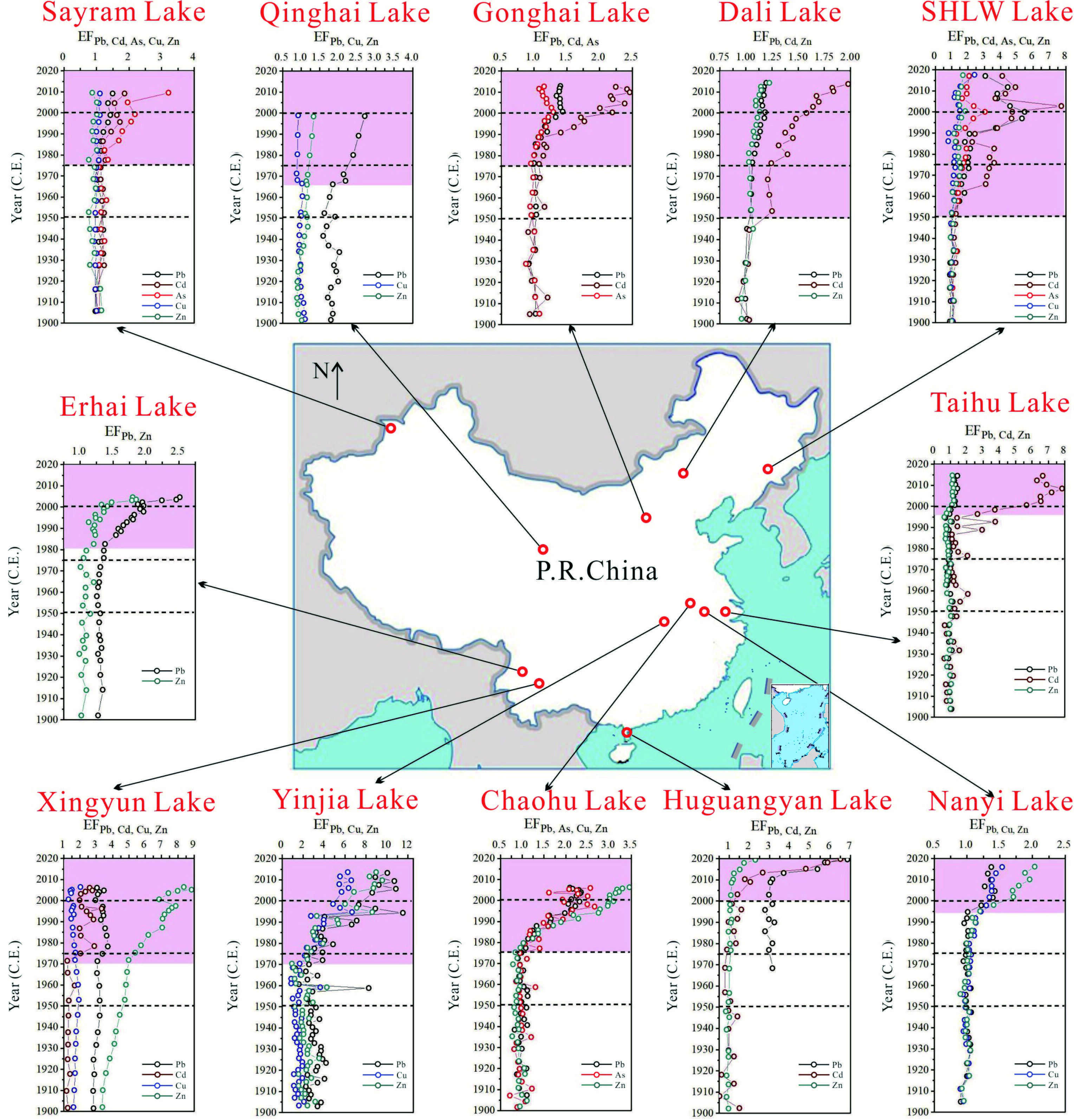 图1 我国典型湖泊沉积物中重金属的富集因子(EF)变化情况,包括四海龙湾玛珥湖、赛里木湖、青海湖、公海、达里湖、尹家湖、巢湖、太湖、南漪湖、洱海、星云湖以及湖光岩玛珥湖。粉色区域代表富集因子开始显著增加的时期。