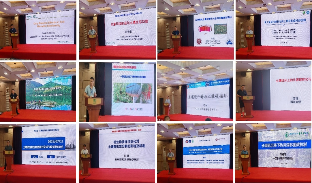 7月11日上午,来自加拿大阿尔伯塔大学、北京大学、华中农业大学、西北农林科技大学、浙江农林大学、南京师范大学、中国科学院地球环境研究所等土壤学领域7个特邀报告。围绕土壤生态与碳循环等核心议题展开了深入且全面的探讨。加拿大阿尔伯塔大学张小川教授探讨轮作体系对农田土壤微生物多样性的影响,为农业土壤管理提供了新视角;华中农业大学刘玉荣教授分析多重环境压力对土壤生态功能的作用,助力应对复杂环境下的土壤保护。在碳循环与固碳机制方面,北京大学朱彪教授研究高寒草地土壤碳循环对全剖面增温的响应,关乎全球气候变化下的碳平衡;西北农林科技大学安韶山教授关注黄土高原植被恢复的固碳效应,对生态恢复成效评估意义重大;浙江农林大学宋新章教授探究毛竹林生态系统固碳特征及机制,为森林碳汇研究添砖加瓦。南京师范大学程谊教授研究设施种植土壤硝态氮累积机制与定向调控,为设施农业可持续发展支招;中国科学院地球环境研究所陈骥研究员聚焦土壤胞外酶与碳循环,深化了碳循环微观机制的认识。7月11日下午,来自全国范围内的15个青年学者专题报告,围绕土壤碳循环和全球变化进行了深入探讨,与会人员认真聆听、积极互动,这些研究报告相互补充、彼此印证,从不同角度为土壤碳循环研究提供了丰富的理论成果。