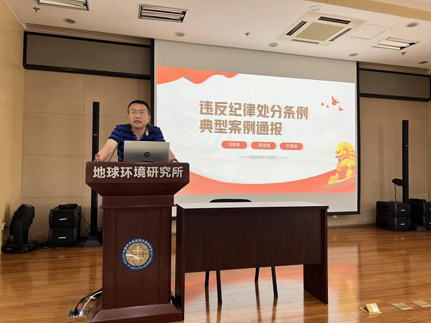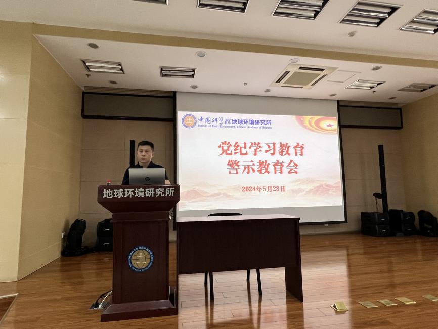 5月28日下午,地球环境研究所组织召开党纪学习教育警示教育会,通报审计发现问题,深刻剖析违纪典型案例,注重用身边事教育身边人,让党员、干部受警醒、明底线、知敬畏。所领导班子成员,中层干部,各研究所主任、各支部书记支委,国重党总支的五个党支部以及行政管理党支部全体党员参加会议,会议由纪委书记孟繁东主持。