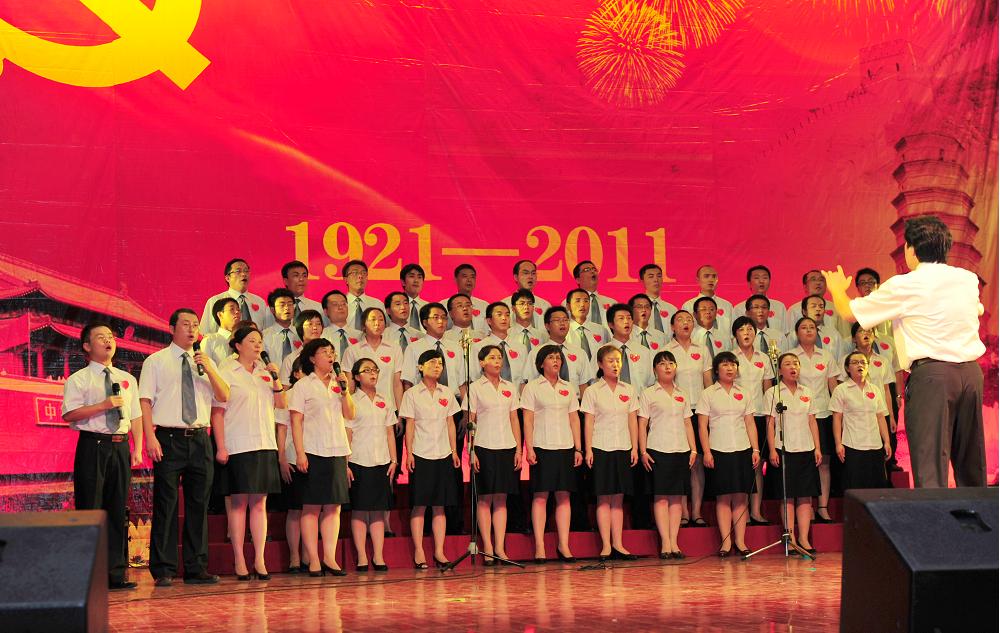 随着《没有共产党就没有新中国》乐曲的奏响,拉开了文艺演出的序幕。演出单位以演唱中国共产党成立90年来各个不同历史时期最具有代表性的红色经典歌曲节目顺序,按“土地革命”、“抗日战争”、“解放战争”、“建设新中国”和“走进新时代”五个部分编排组成,生动的再现了中国共产党90年的光辉历程。一曲曲经典红歌逐渐将演出的气氛推向高潮。我所演出的两支曲目“祝福祖国”和“共和国之恋”经过了两个多月的排练,在全所演出人员和指挥老师的配合之下终于圆满完成,获得台下热烈的掌声。演出中,演员们以鲜艳的服装、饱满的精神面貌和激情四溢的歌声表达了对党的祝福,对祖国的热爱和对中华民族的歌颂。
