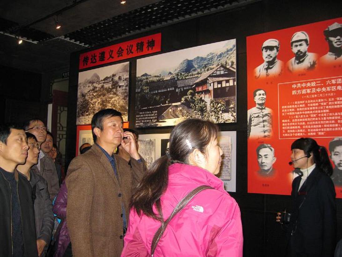 在遵义,我们参观了遵义会议会址、陈列馆、博古旧居、苏维埃银行旧址、红军街等。在纪念馆讲解员的引导下,我们了解到,一九三五年的遵义,连遭重创的红军,不但人数少,装备差,根本无法与国民党的军队相比。在这危难之时,中共中央召开了遵义会议,纠正了“左”倾路线,改组了中央领导机构,确立了毛泽东同志在全党全军的领袖地位,一个成熟的政党和一代领导集体从遵义开始形成。遵义会议在中国革命的危急关头,挽救了党,挽救了红军,挽救了革命,它将永世流传,永放光芒。红军强渡乌江天险、四渡赤水的场景似历历在目,娄山关的炮声,赤水河的浪涛声,雪山草地红军战士艰难跋涉……肃立在简朴而狭小的会议室,行走在当年红军司令部、政治部驻地的走廊,端详着一件件看似普通却凝固非凡历史密码的文物,遥想革命先辈当年在此山此水间的血火拼杀、金戈铁马,政治风云、唇枪舌剑。这一切的一切,都使我们内心震撼!激情奔涌!我们深深地感受到中国革命斗争的艰苦,中国革命政权来之不易;感受到了红军长征的艰难,更感受到中国共产党的光荣和伟大。能够成为中国共产党中的一员,我们深感光荣和自豪。