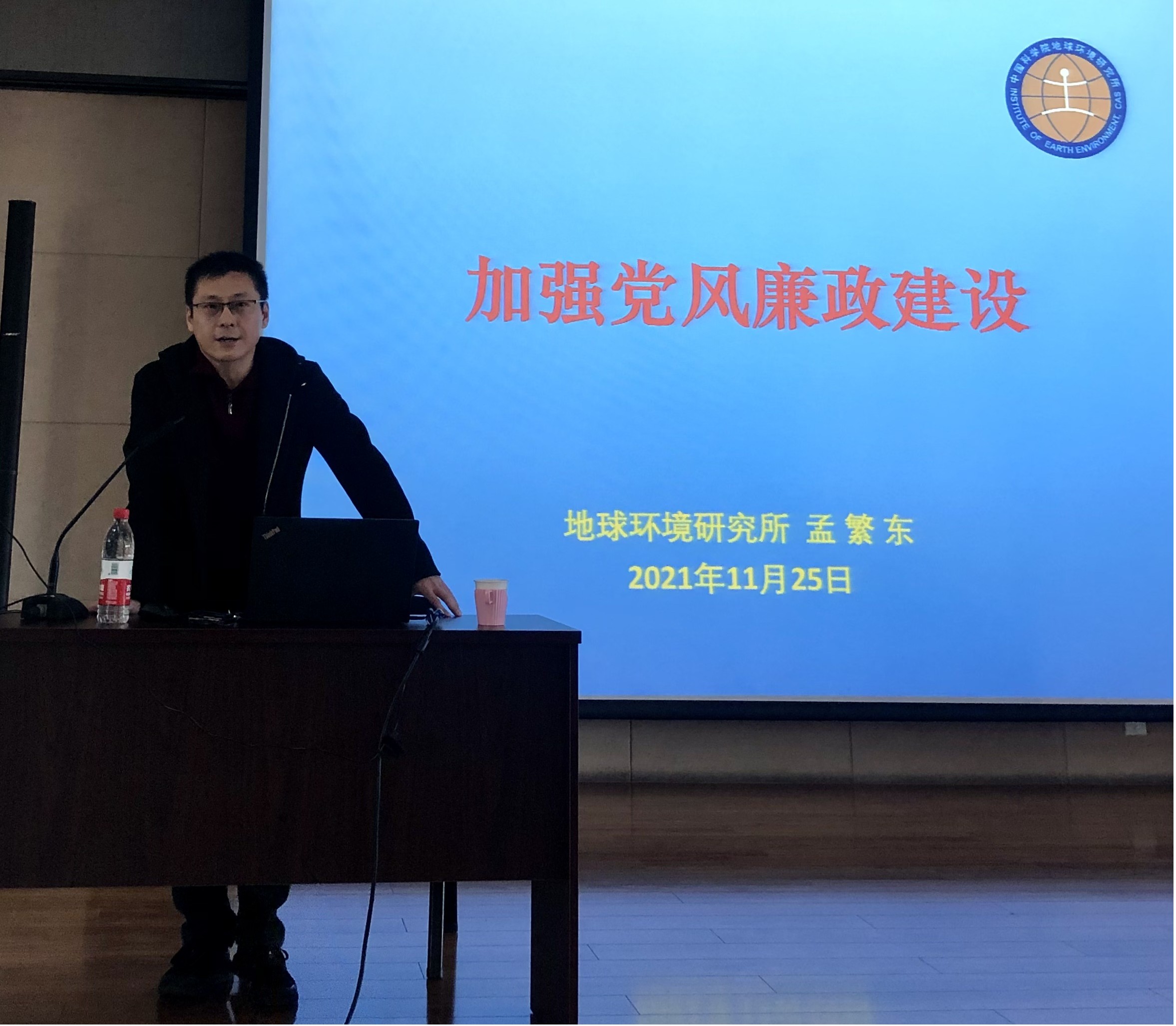 为进一步贯彻落实全面从严治党要求,强化党员干部廉洁自律意识,增强对党忠诚、拒腐防变的思想自觉和行动自觉,11月25日地球环境研究所举办2021年廉政党课报告会。研究所全体中层党员干部、副研以上科研人员参加报告会。会议由党委委员李红兵主持。