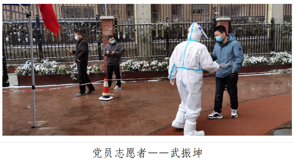 “疫情来临,身为一名共产党员,就该挺身而出,为小区群众做好保障工作。”党委委员、行政后勤党支部书记武振坤同志看到小区招募志愿者的信息,火速报名,核酸检测秩序维护、信息核验、物资分发,哪里需要哪里就有他的身影。