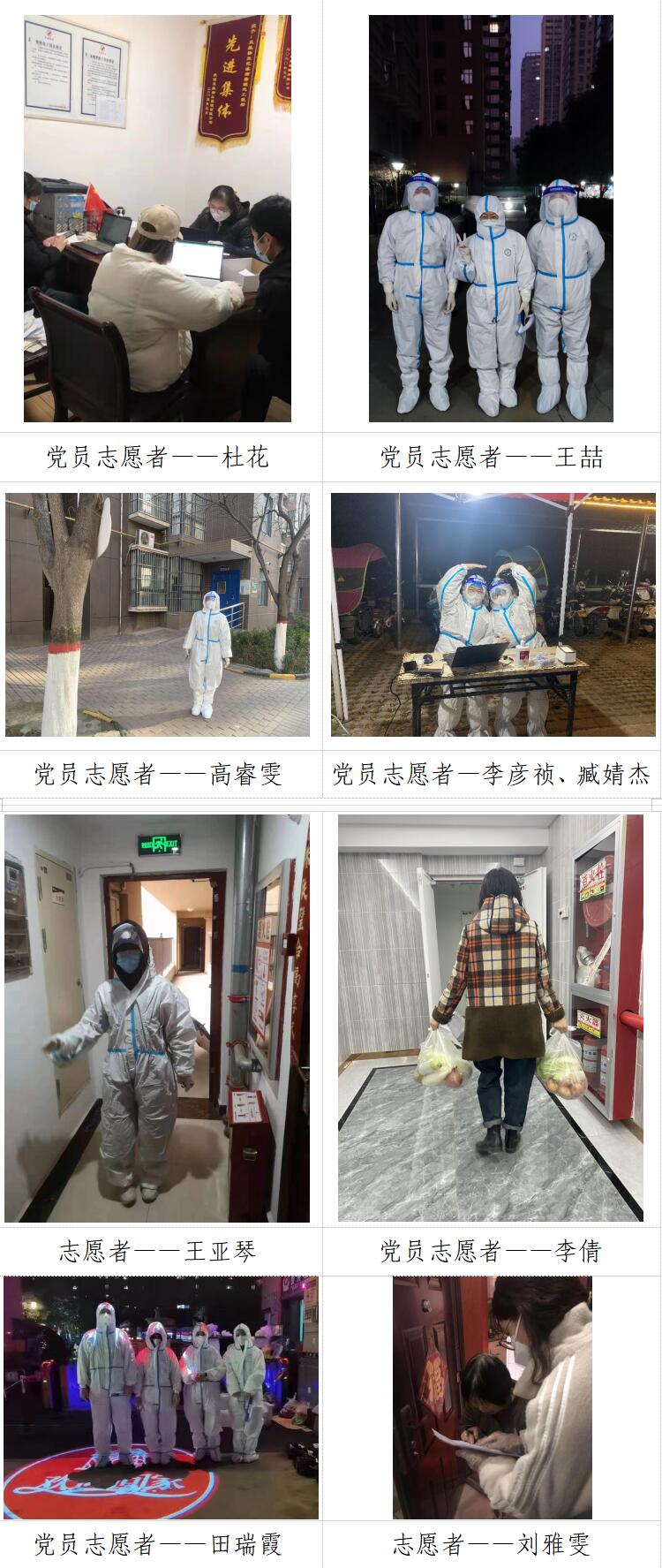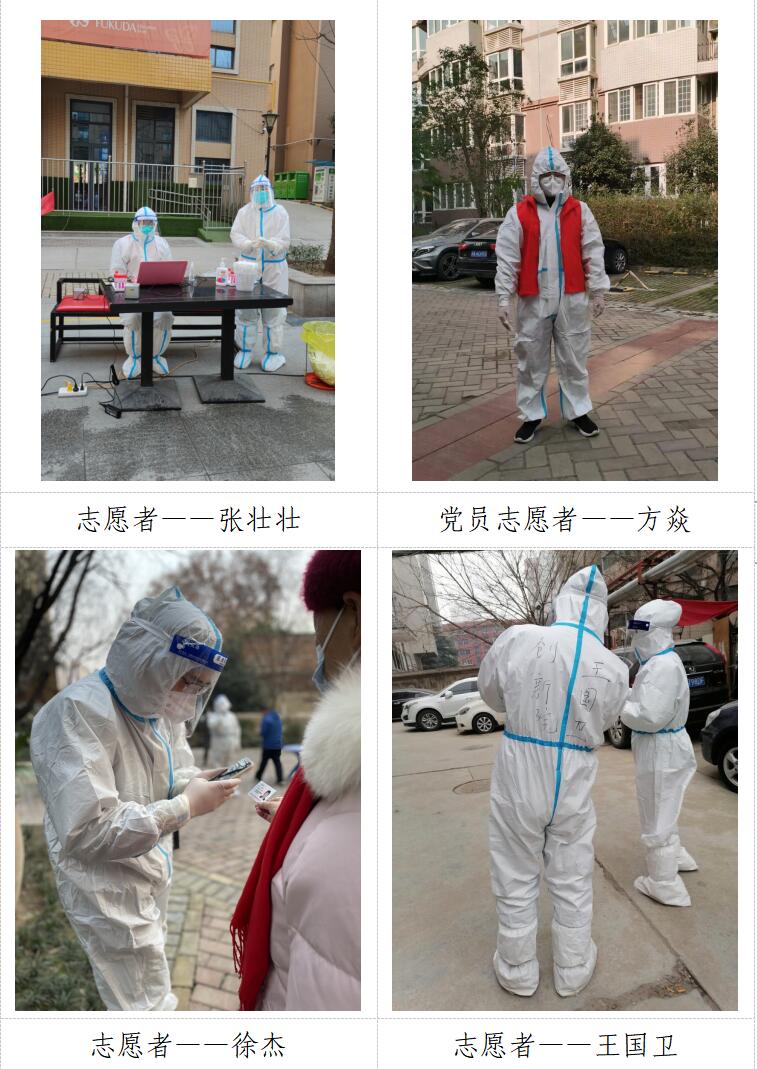 “疫情来袭,作为新时代学生党员,我们要充分发挥自己的光和热,主动服务基层、服务群众。”研究生支部党员王疆涛自12月25日起,自发组织小区里的年轻人成立志愿者队伍,参与到小区核酸采集、物资发放的工作中去。党员王曦谦、蔺悦、张勇、张涵玉、肖静芸、薛景彦、杨岭、黄钊,入党积极分子炊郁达,学生周京雄,赵楠钰,张权等,也分批加入到志愿者队伍中,搬运发放物资,了解登记居家居民生活困难,协助社区物业解决各种问题,他们的身影活跃在社区的各个角落。