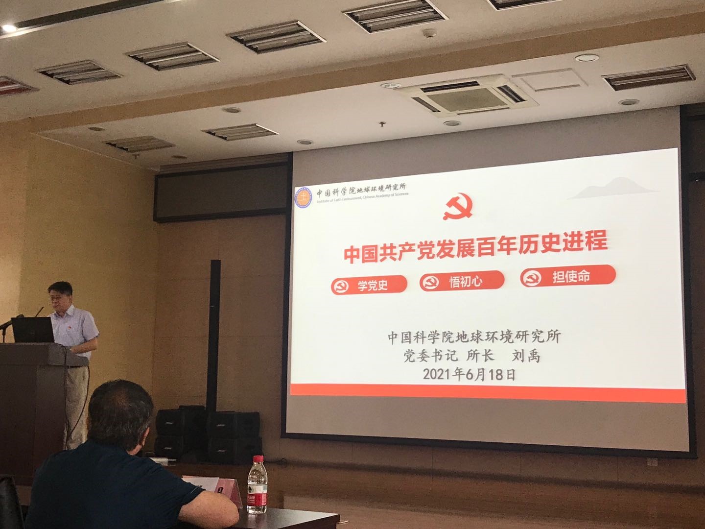 6月30日上午,地球环境研究所举行庆祝建党100周年党员大会,党委书记做专题党课。纪委书记康贸易主持会议,西安分院分党组副书记詹瑞、党群处白桦同志到会指导,全体在所党员参加大会,会议邀请所民主党派和职工代表参加。