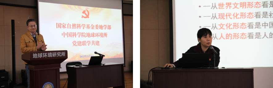 自然科学基金委地学部党支部书记、常务副主任于晟同志领学党的二十届二中全会精神、习近平总书记在学习贯彻党的二十大精神研讨班开班式上的重要讲话精神以及在中央政治局第三次集体学习时的重要讲话精神。中科院地球环境所党委书记、所长孙有斌以“围绕科技创新 强化党建引领”为题,介绍了研究所概况及党建工作。
