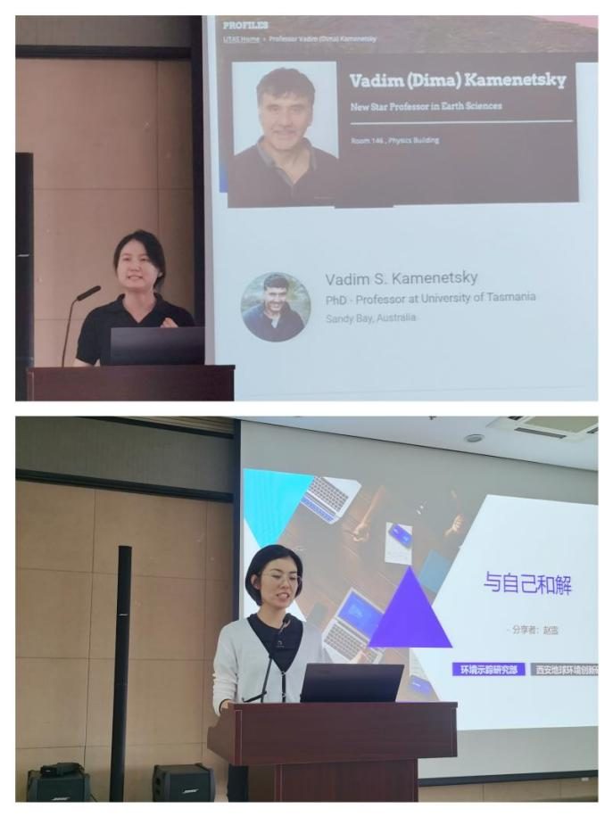 活动还邀请青年科研优秀代表——环境变化研究部张明玉博士和环境示踪研究部赵雪博士作经验交流报告。张明玉从留学经历、科研方向、野外工作三方面展开经验分享,回顾在澳大利亚的留学经历,她表示要将学生阶段作为自己人生中的关键时光去享受,使自己的生命与学术获得滋养与成长,她攀登美丽而神秘的青藏高原、穿越飞沙走石的塔克拉玛干沙漠、研究独具特色的西昆仑山黄土剖面,保持兴趣和热爱,在中亚粉尘物源方向用一沙一石拼出成果。赵雪主要从科研方向、科研心路历程、心态调整三方面分享,核环境安全、人工放射性核素示踪研究、人类世“金钉子”等内容是她孜孜不倦、奋力耕耘的学术园地,累累硕果的背后有着她不为人知的艰辛,当中有过自我否定、有过夜不能寐,纵然科研百般滋味,科研仍需面对,与其纠结和焦虑,不如拼搏现在,心平气和地保持对生活的热爱和对工作的尊重,时间和汗水必定会还你一个精彩的自己。