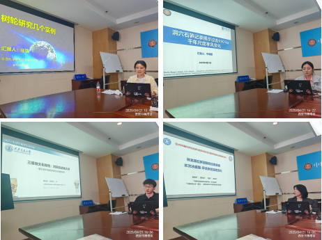 在学术报告环节,地球环境所植物理化分析测试平台技术负责人任萌、洞穴实验室博士生唐慧茹,西安交通大学人居学院博士生牛晓雯和潘良康分别针对树轮气候学研究、石笋团簇同位素的应用、石笋揭示季风变化和在三星堆文化韧性的机理解释等科学问题做了精彩的学术报告,并展开学术讨论。