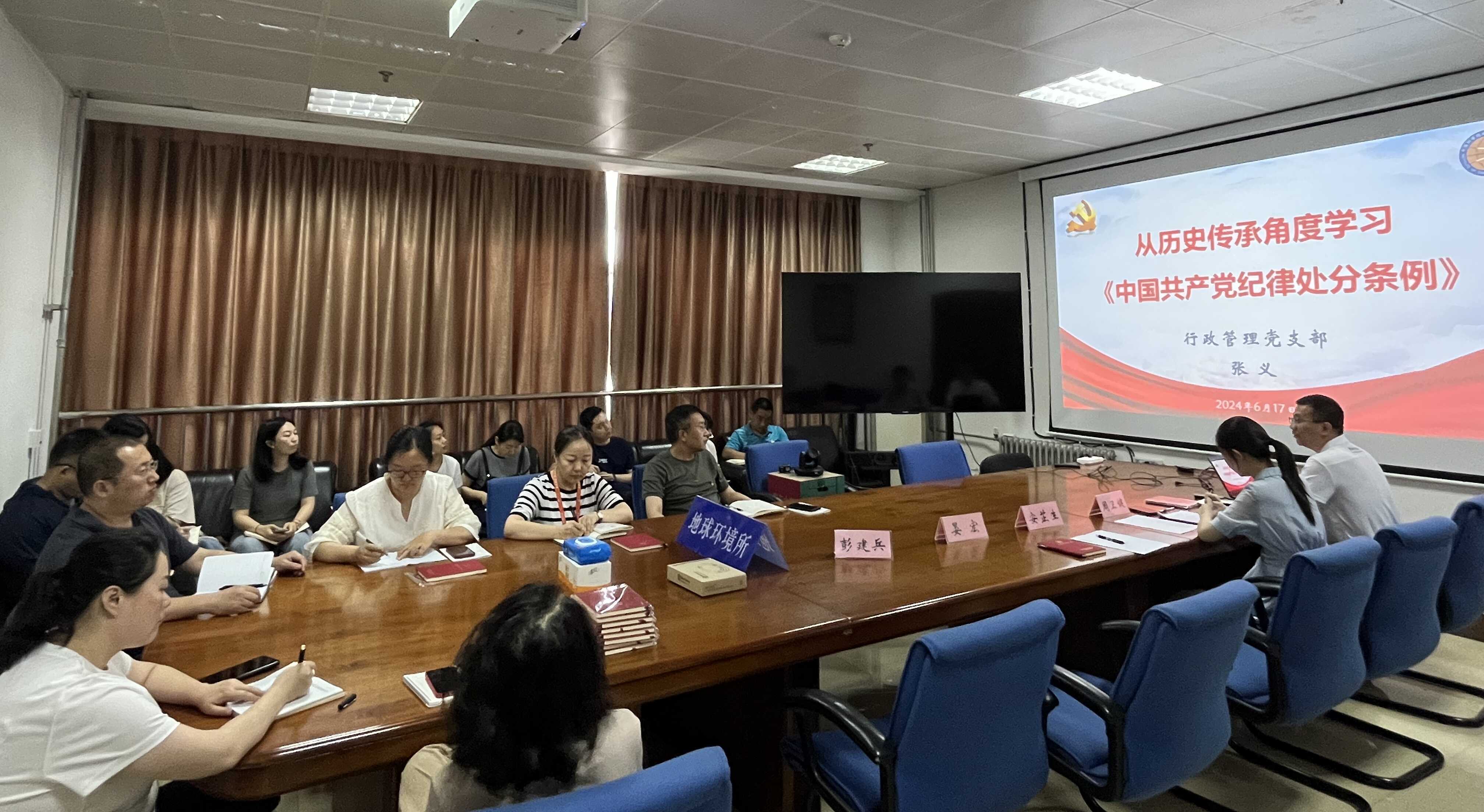 为进一步推进党纪学习教育走深走实,6月18日下午,行政管理党支部开展“学党纪,促攻坚”主题党日活动,支部书记张义主持活动并讲授党纪学习教育专题党课。