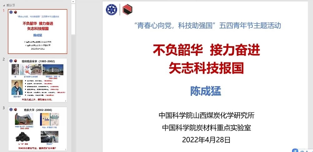 为迎接党的二十大胜利召开,纪念共青团成立100周年,2022年4月28日上午,分省委团工委举办了 “喜迎二十大、奋进新征程”主题活动,活动的内容是弘扬科学家精神主题报告。会议通过线上形式开展,研究生党支部全体党员参加了会议。