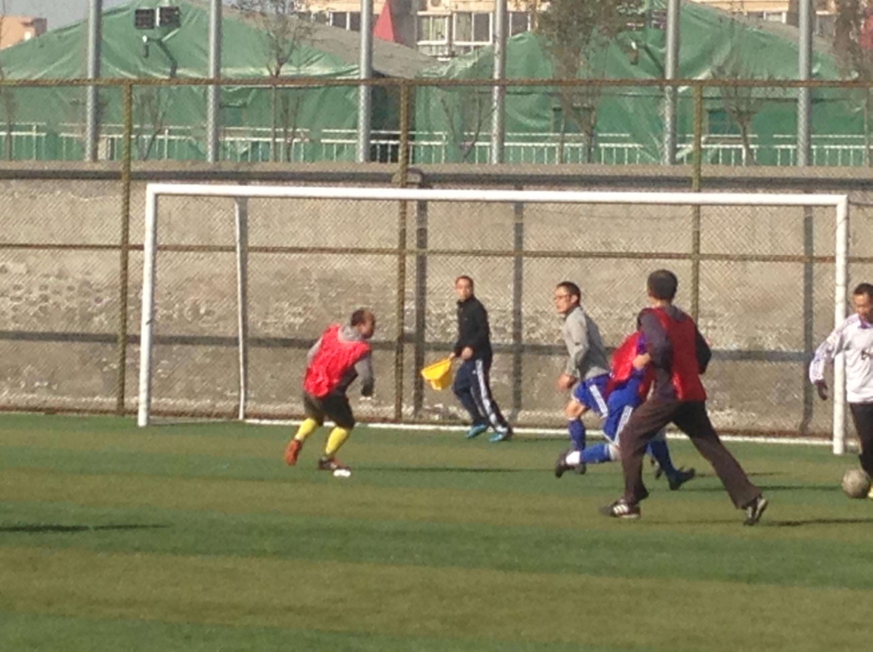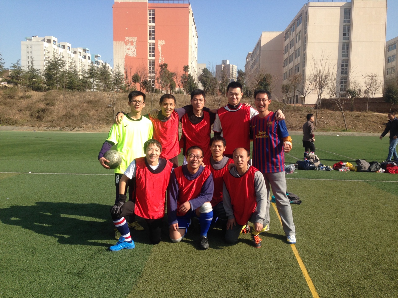 首场比赛于2015年12月25日在西安理工大学曲江西校区打响,对阵双方为粉尘与环境研究室队和加速器质谱中心队。粉尘与环境研究室队经过赛前的精心部署,表现出攻守严谨、有的放矢的作战风格;加速器质谱中心队场上火力十足,但组织欠佳、配合不利,未能有效攻破对方的防线。交战中,双方队员都表现出顽强拼搏的竞技精神,尤其是以胡塔峰、吴枫老师等为代表的“老队员”们,积极拼抢的气势丝毫不输年轻人。本场比赛的裁判组亦是尽职尽责,从主裁的明察秋毫到边裁不言疲倦的跑动,表现出极高的执法水平。最终粉尘与环境研究室队以4:1获胜,取得暂时领先。