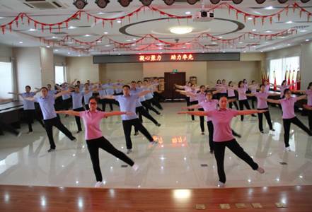 随后,所工会组织了职工、学生等50余人在多功能厅集中进行了第九套广播体操的展示活动。展示中,大家精神抖擞,首挺胸,伸展,扩胸、转体……动作整齐到位,每一节、每一个动作都完成得干净利落,动作娴熟,张弛有度,充盈着刚健之美。充分展示出地环所人健康的精神风貌。