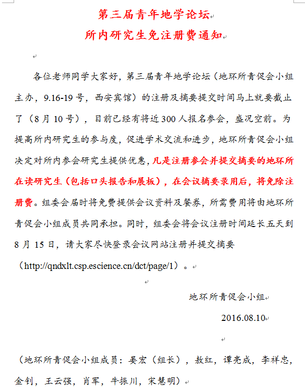 第三届青年地学论坛(地环所青促会小组主办,9.16-19号,西安宾馆)的注册及摘要提交时间马上就要截止了(8月10号),目前已经有将近300人报名参会,盛况空前。但是从目前的报名情况来看,所内研究生的参与程度并不高。为提高所内研究生的参与度,促进学术交流和进步,地环所青促会小组决定对所内参会研究生提供优惠,凡是注册参会并提交摘要的地环所在读研究生(包括口头报告和展板),在会议摘要录用后,将免除注册费。组委会届时将免费提供会议资料及餐券,所需费用将由地环所青促会小组成员共同承担。同时,组委会将会议注册时间延长五天到8月15日,请各位老师发动所内研究生参与此次会议,登录会议网站注册并提交摘要(http://qndxlt.csp.escience.cn/dct/page/1)。