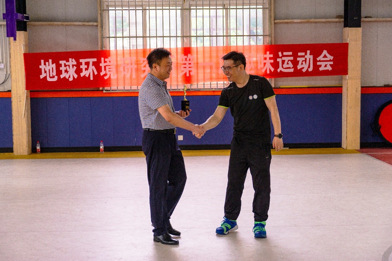 比赛结束后,西安地球环境创新研究院刘春卓副院长为获奖队伍颁发奖杯与奖品,地球环境研究所第一届趣味运动会圆满结束。