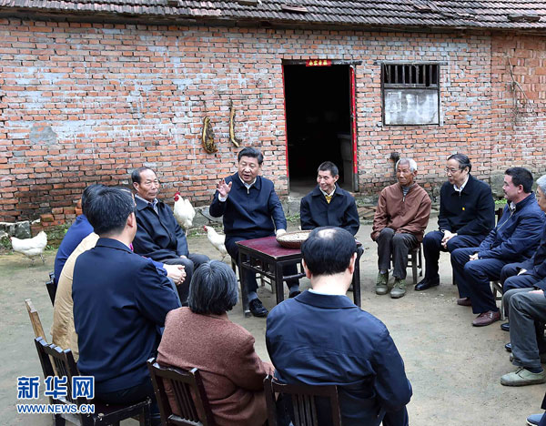 2016年4月24日至27日,中共中央总书记、国家主席、中央军委主席习近平在安徽调研。这是4月24日下午,习近平在六安市金寨县花石乡大湾村村民陈泽申家同村民们亲切交流。 新华社记者 李涛 摄