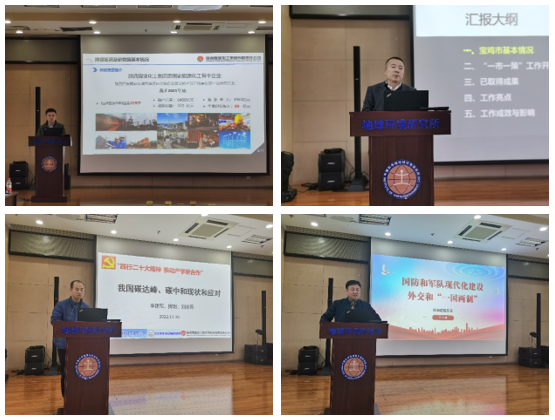在会议报告阶段,陕煤化工所史江维研发员作“陕煤研究院化工所技术需求情况汇报”报告,地环所刘随心正教授级高级工程师作“科技服务城市大气治理” 报告,地环所李建军研究员作“我国碳达峰、碳中和的现状和应对”报告,创新院刘春卓副院长作“关于二十大报告中国防、外交、‘一国两制’等内容的分享与交流”报告。通过报告分享,与会党员在共同学习二十大精神的基础上,进一步增进了了解、加深了合作,展现了各自技术优势和研究潜力,找到了更多业务合作切入点。