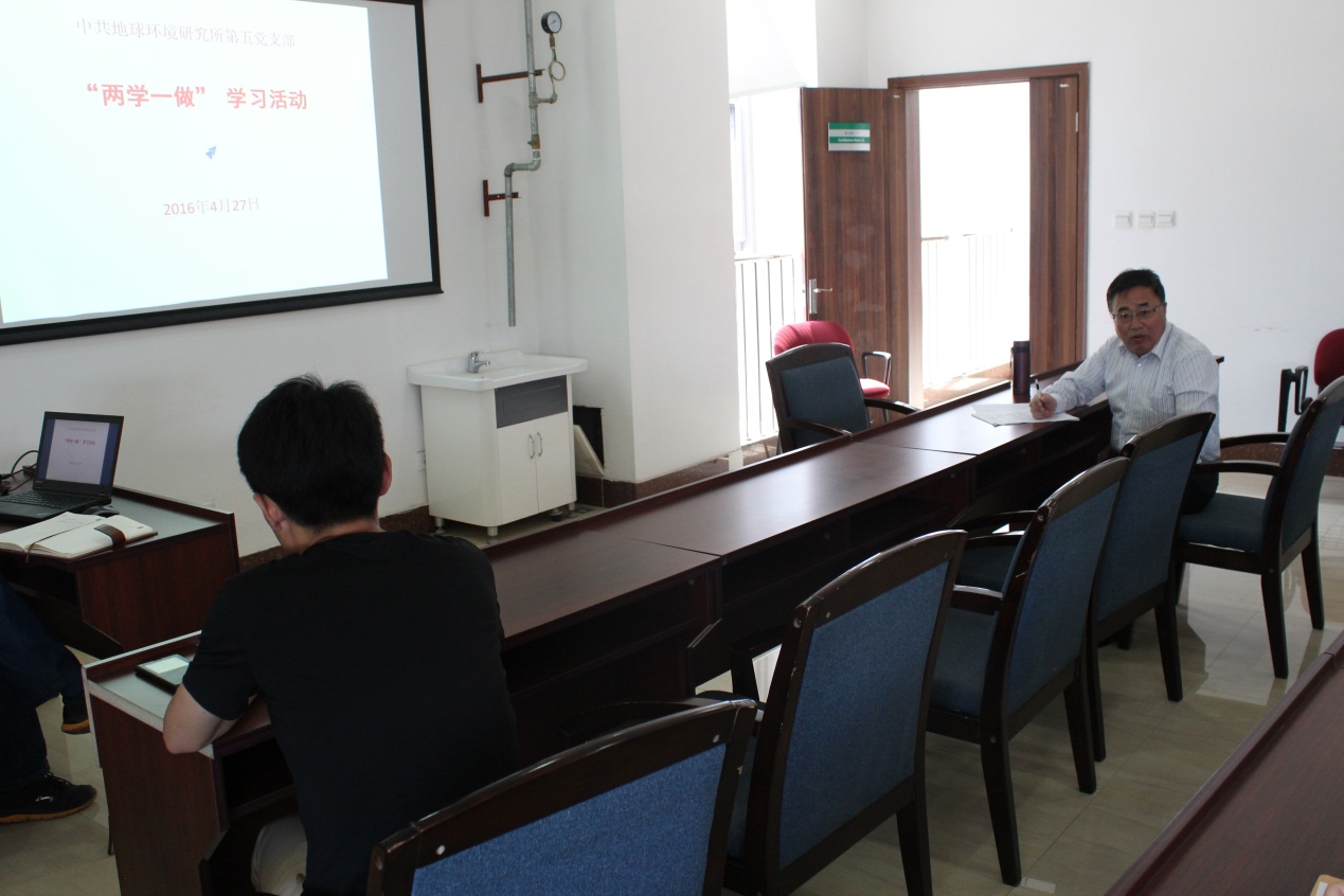 2016年4月27日下午,科研第五党支部根据《中国科学院党组关于深入推进“两学一做”学习教育的通知》文件精神,结合研究所党委的工作部署,进行了“两学一做”专题学习活动。 所党委副书记康贸易同志参与了支部集体学习并做了指导发言。