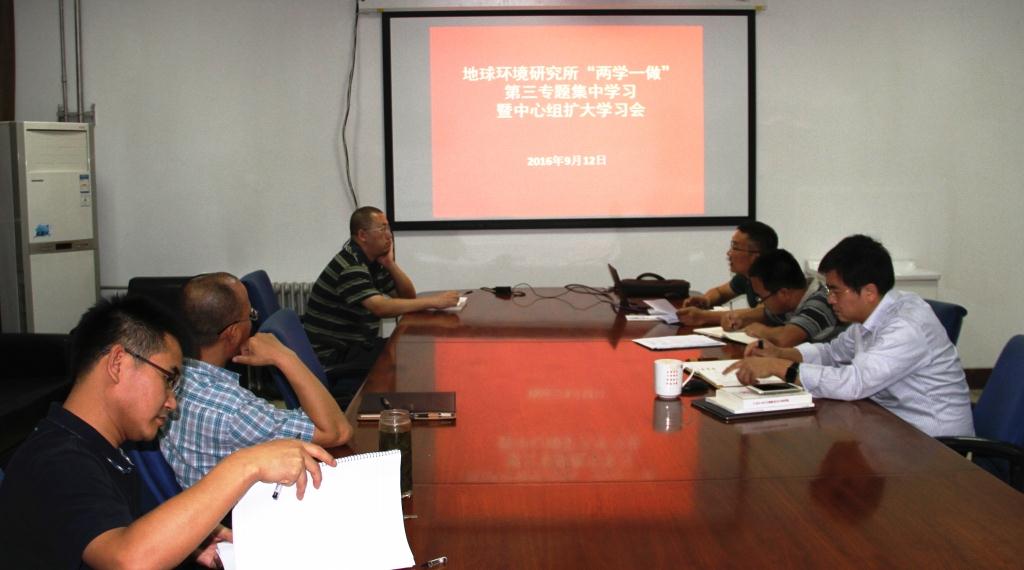 9月12日下午,地球环境所举行“两学一做”第三专题—学讲话,增强“四个意识”集中学习暨中心组扩大学习会。在所行政班子成员、党委委员、纪委委员、党支部书记、支委、及处级干部参加了学习。