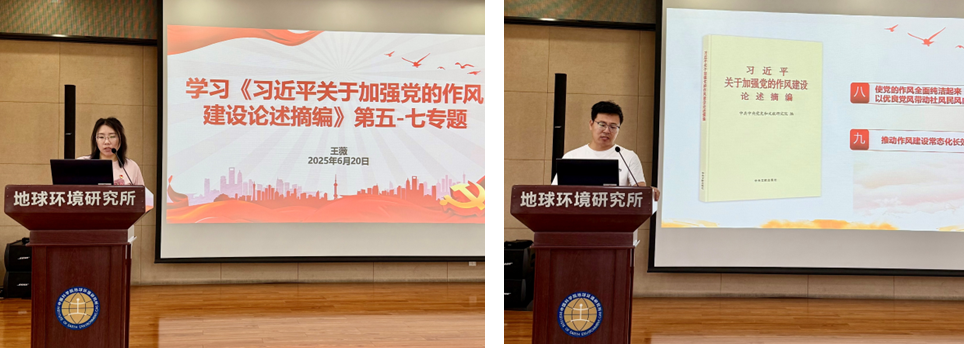 会上,王薇和方焱同志分别领学了《习近平关于加强党的作风建设论述摘编》的部分内容,王薇通过介绍“四风”的危害和表现,深挖“四风”问题的实质和思想根源,提示大家对“四风”问题的各种变异表现保持高度警惕;领导干部作为新时代作风建设的关键主体,要身体力行,以上率下;通过学习加强了党员对正风肃纪反腐三者的认识,必须结合起来一起抓才能推进党的自我革命层层递进、革故鼎新。方焱以《作风建设永远在路上》为题,阐述了要发扬“三严三实”,纠正“四风”,才能使党的作风全面纯洁起来,以优良党风带动社风民风向上向善,通过总结新时代作风建设理论的重要意义,使大家认识到抓好作风建设非一日之功,只有起点、没有终点,只有进行时、没有完成时,永远在路上。