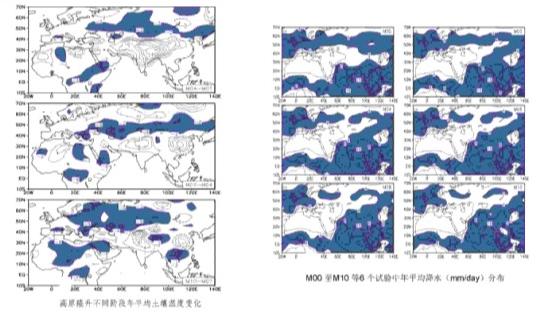 b: 青藏高原隆升在亚非干旱化过程中的作用。数值试验说明,反映高原隆升与中亚和北非干旱化同步的地质事实可能并非巧合,而应该是一种确实的因果关系。结合相关的其它地质证据可以推断,高原隆升在新生代以来亚洲内陆干旱化过程起了重要作用,这与轨道尺度上东亚季风变化的强迫因子明显不同。数值试验也说明,即使没有青藏高原,北非至大约25-45°N之间的欧亚大陆依然为干旱区,同时与热带季风相联系的高降水区依然存在。