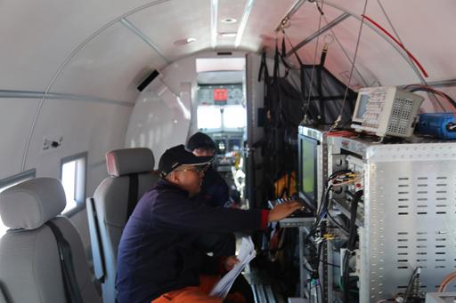 考察队员在机舱内处理探测数据 吴 琼 摄