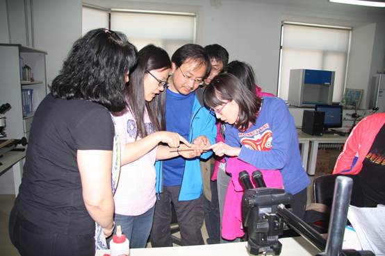 随后教师代表一行来到了岩心库,壮观的岩心库和丰富的样本库存引得大家不住的惊叹。工作人员的详细介绍和悉心讲解也获得了一致好评。在树轮室,多种的树轮样品在工作人员的介绍下让大家对科研工作有了更加直观的了解。代表们还在工作人员的带领下亲自上阵在显微镜下观察树木年轮,体验了简单的数树轮工作。最后,教师代表们还去参观了气溶胶实验室,了解了雾霾的成因危害以及实验室对于除霾治霾工作所取得的一系列研究成果。