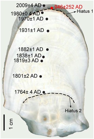 切开的石笋剖面(图片来自谭亮成2016年Climate Dynamics文章,数字为该点位测试出来的年代)