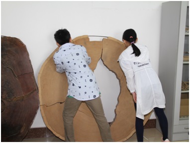 树轮也具有层状结构,通过一层一层的宽窄变化,也能够提取到气候变化的信息。在树轮实验室,孩子们都惊诧于那个摆在墙边直径约1.3米的树轮,在王璐博士生讲解下,大家才知道,那个树轮年纪不大,其实才2-300年。