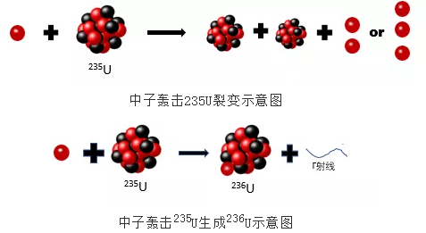 说了那么多,咱们的 “主角”——236U怎么还没出场啊?莫着急,以上是做个铺垫,也是交代个背景。上面说了用中子轰击235U时会发生裂变,但是有一部分在形成236U(α衰变,T1/2 = 2.34 ×107y)后不再裂变,这一过程可以用235U(n,γ)236U表示。而发生这一过程的几率,我们用截面符号σ(单位:巴(b))来表示,σ=86.7b;除了235U,它的孪生哥哥238U在中子的轰击下也会产生236U,σ=0.4b(238U(n,3n)236U)。