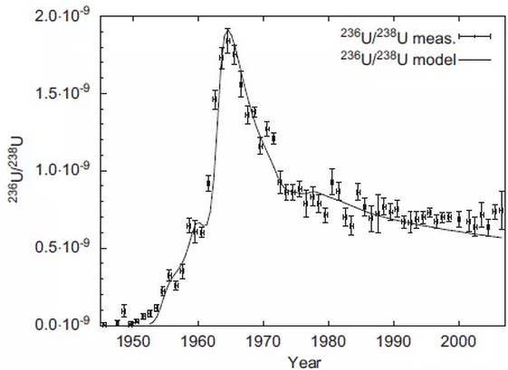 说完天然来源的236U,自然就该介绍人为来源的236U。从1945年到1980年,几个核大国在天上和地下放了很多“大炮仗”。我们知道每当到了春节,空气里火药味十足。我们是不是也可以闻到这些“大炮仗”味道?显然不会(要不然人类早已化为尘土了)!但世界各地的核试验向大气中释放的236U早就把我们包围了(全球沉降避无可避,举手投降吧)。除了核试验,核反应堆是形成236U的另一大场所,但这部分236U主要存在于反应堆内部和封闭较好的乏燃料中,总量虽大但是相对安全(处于封闭状态)。在某些地区,由于核废料后处理厂及核电站事故会增加当地的236U含量,并造成了一定量的人员伤亡,从而加重了人们的“恐核”心理。