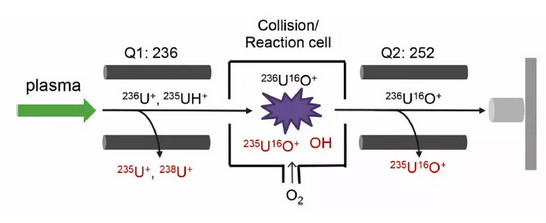 科学永无止境,科学家的脑袋里千奇百怪的想法转化为现实后,原来一切看似不可能的东西又一一变为可能。不知道当初在碰撞反应池前再加一个四级杆是不是专门为测量锕系核素设计的,但最终形成的ICP-MS/MS,确实在测量236U时起到了意想不到的效果(236U/238U约为1×10-10,基本原理见示意图)。