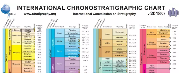根据2018年7月13日国际地层委员会(ICS, International Commission on Stratigraphy)更新的国际年代地层表(2018年7月版),第四系和寒武系分别增加了新的金钉子和新的阶段。