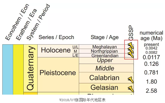 新的金钉子发布表明古气候学家所关注的第四纪全新世的4.2ka(千年)冷事件被认定为新的梅加拉亚期(Meghalayan)的起始点。