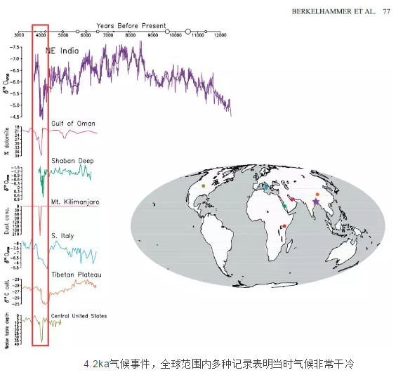 晚全新世的梅加拉亚期,最近被批准为地质时代标尺的最新(最上)单元,4200年前,世界各地的农业文明经历了一场突然而严重的特大干旱和冷事件。经过众多第四纪科学家多年的研究,国际地层委员会的各小组委员在仔细审查提交上来的申请材料后,决定将梅加拉亚期定义为我们人类所处的最新时代。上个冰河时代结束后,在4200年前,世界上很多地方发展起来的农业文明,遭受到了持续约200年的干冷气候事件的严重影响,这些气候事件导致了埃及、希腊、叙利亚、巴勒斯坦、美索不达米亚、印度河流域和长江流域文明的崩溃和人类的迁徙。在七大洲,地质学家们都发现有4.2ka气候事件的证据;这些证据表现在洞穴石笋,湖泊沉积物,海洋沉积物,泥炭,黄土等沉积物中气候代用指标的突变,指示着全球气候在4200年前,有持续强烈的变冷变干状态。