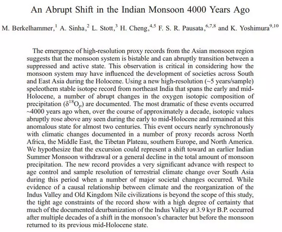 4. Berkelhammer M, Sinha A, Stott L, et al. An abrupt shift in the Indian monsoon 4000 years ago[J]. Geophys. Monogr. Ser, 2012, 198(7).