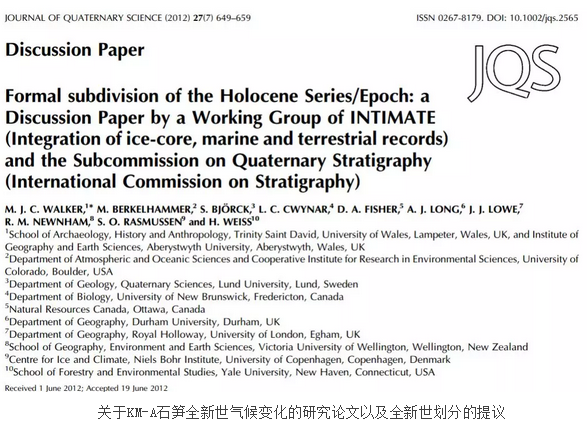 6. Walker M J C, Berkelhammer M, Bj?rck S, et al. Formal subdivision of the Holocene Series/Epoch: a Discussion Paper by a Working Group of INTIMATE (Integration of ice‐core, marine and terrestrial records) and the Subcommission on Quaternary Stratigraphy (International Commission on Stratigraphy)[J]. Journal of Quaternary Science, 2012, 27(7): 649-659.