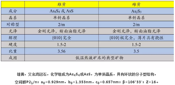 雄黄和雌黄都属于简单硫化物,具有相似的化学组成,晶系,成因,产状,相似的性质,用途。