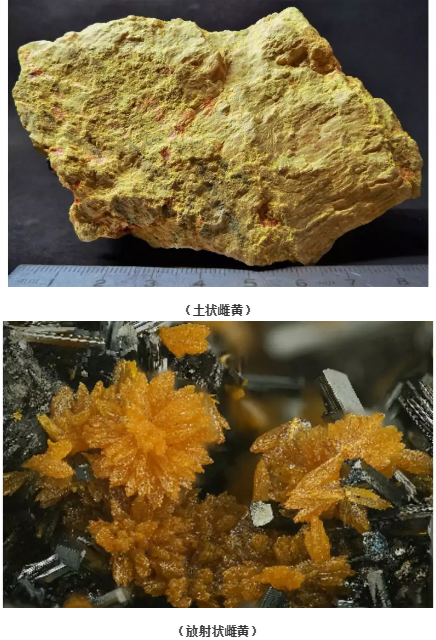 雌黄:硬度1.5~2; 薄片具挠性。 具有平行{010}极完全解理; 常呈柠檬黄色,条痕鲜黄色; 集合体呈片状、梳状、放射状和土状等; 单晶为板状或短柱状,晶面常弯曲,柱面有纵纹; 具油脂-金刚光泽,解理面珍珠光泽,薄片透明; 常在低温热液矿床中与雄黄共生; 火山凝华物中与自然硫、氯化物共生。 我国湖南、云南、贵州、四川、甘肃等省均有产出,尤以湖南和云南著名。