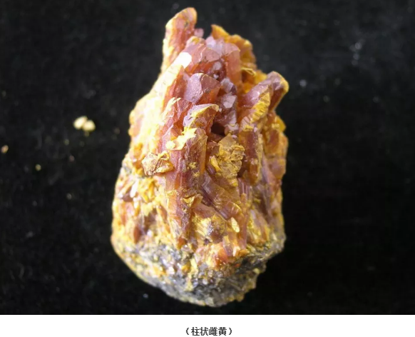 雄黄:透明~半透明; 莫氏硬度1.5-2; 相对密度3.56; 具有平行{010}的完全解理; 常呈桔红色,条痕淡桔红色; 性脆,阳光久照变为淡桔红色粉末; 主要呈柱状、短柱状或针状,柱面有纵纹; 常以粒状、土状或皮壳状集合体产出; 晶面金刚光泽,断面油脂光泽; 主要产于低温热液矿床和硫质喷气孔,与雌黄共生; 是砷的主要矿石矿物; 用槌击之有刺鼻的蒜臭味。